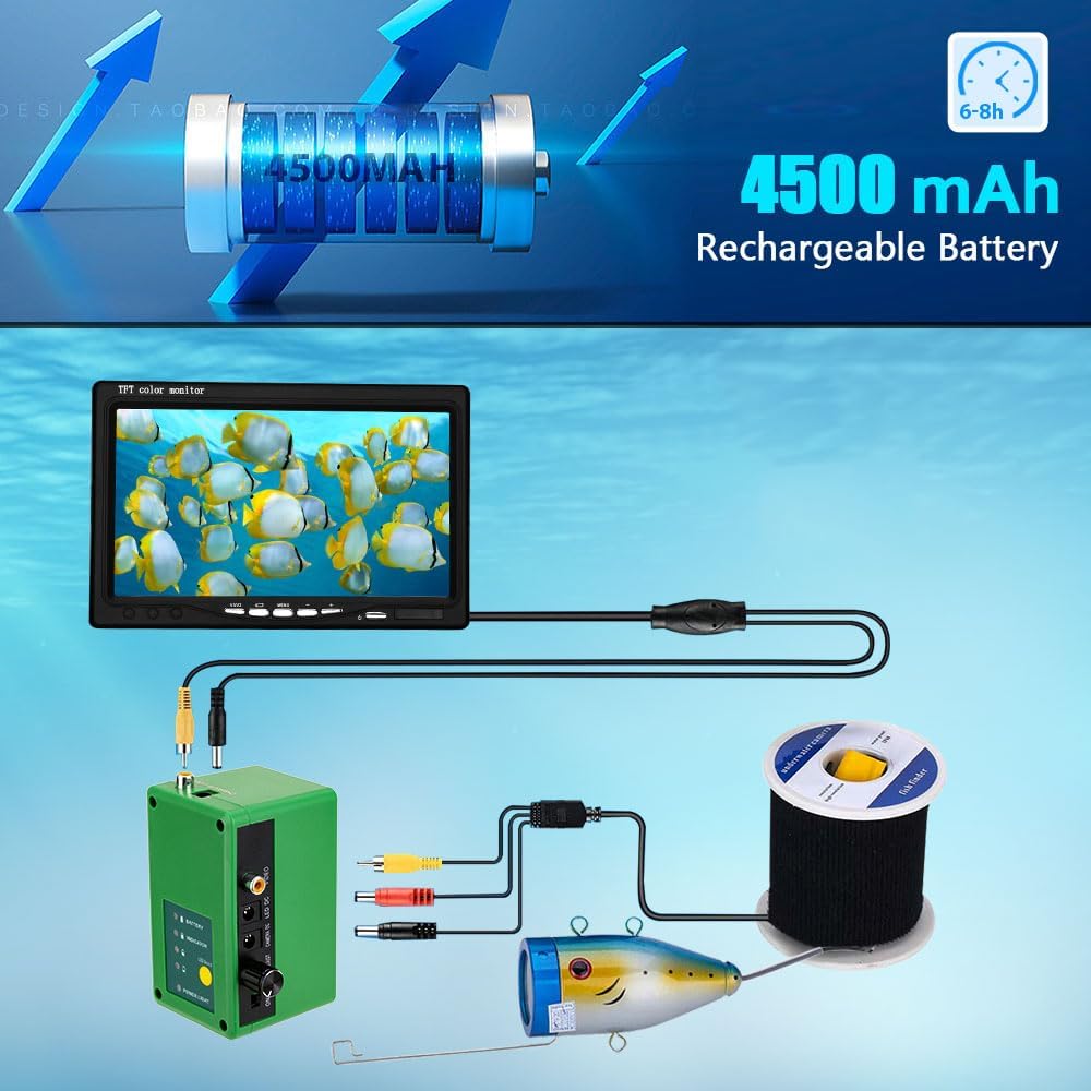 4500mAh Rechargeable BatteryWith 4500mAh rechargeable battery, The underwater fishing camera can continue work 8 hours,with 12.6V 2000mA charger for stable charging. |